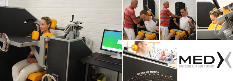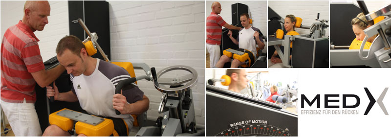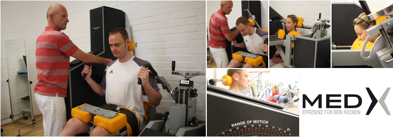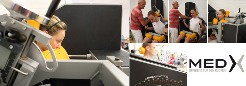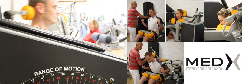 Diese umfangreiche Diagnostik liefert die Basis, um für jeden Patienten eine individuelle Therapie planen zu könne. Die ermittelten Daten werden mit den an der Universität von Florida gewonnenen alters-, geschlechts- und gewichtsspezifischen Normdaten verglichen. Ziel der MedX-Therapie ist es, durch aktive Rekonditionierung mittels Muskelaufbautraining die Funktion der Wirbelsäule (Kraft, Beweglichkeit, Kraftausdauer) wiederherzustellen. Die computergestützten Therapiegeräte Lumbal Extension Maschine (LE) und Cervical Extension Maschine (CE) ermöglichen ein isoliertes und kontrolliertes Training der Lendenwirbelsäulen- bzw. Halswirbelsäulenmuskulatur. Wir verfügen über mehr als zehnjährige praktische Anwendungserfahrung mit diesem Therapieverfahren. |